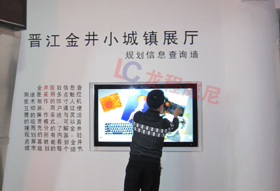 福建金井城市規劃廳項目,深圳龍程威尼采用了P5的LED的大屏、AMOUY46寸的DID液晶拼接屏、55寸的互動觸摸屏,和展廳整體設計的結合來全方位展示城市的布局與規劃。